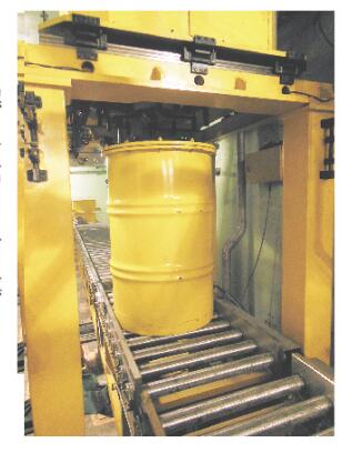 4.從空的鋼桶進(jìn)入、設(shè)備自動對接、找螺栓位置、擰松桶蓋螺栓、抓取桶蓋、空桶離開去裝填區(qū);到裝填料后的桶子返回又一次自動對接、找螺栓孔位置、蓋桶蓋、擰緊螺栓到裝料桶離開,整個(gè)過程完全自動;